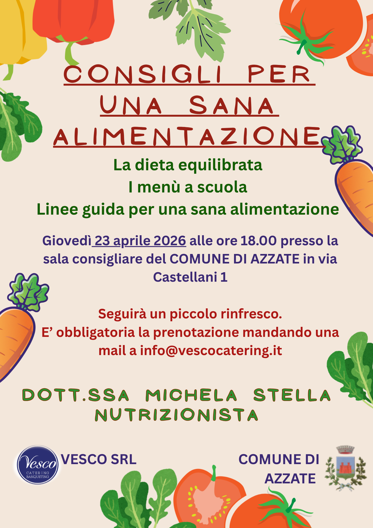 incontro il giorno 23 aprile 2026 alle ore 18:00 presso la sala consiliare del Comune di Azzate sulla sana alimentazione - menù a scuola - dieta equilibrata.